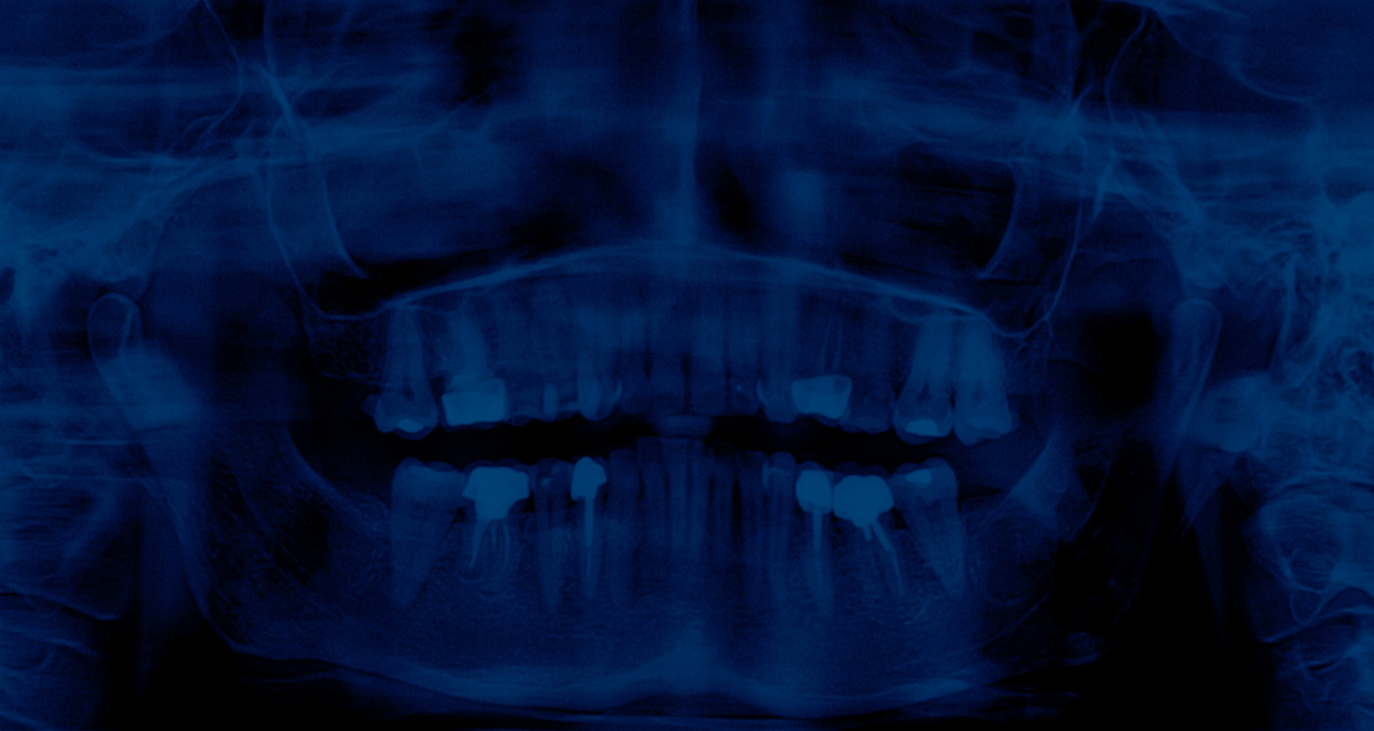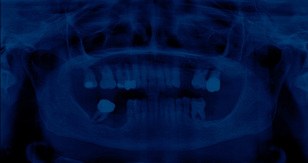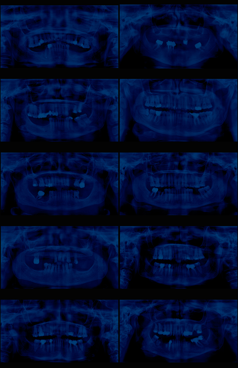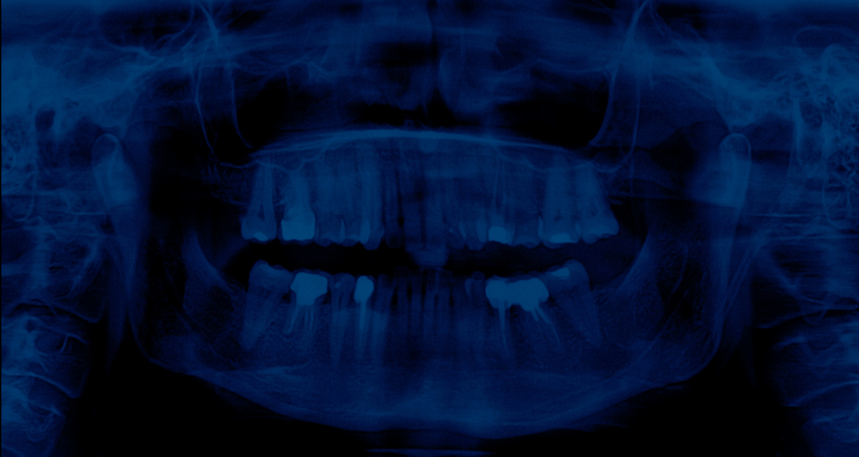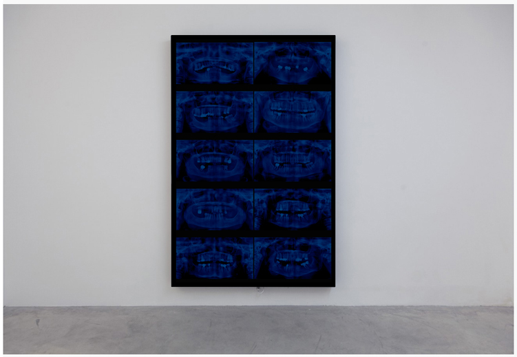 En choisissant la radiographie dentaire, l’artiste détourne un objet du quotidien pour en faire un symbole universel de la disparition. Chaque dent, empreinte unique d’une vie, est ici réduite à une forme abstraite, vidée de sa substance. Le mur de radiographies, tel un mur des pleurs, devient un lieu de recueillement où le spectateur peut déposer sa propre douleur. Le bleu, couleur de la mélancolie, amplifie l’atmosphère de deuil.
